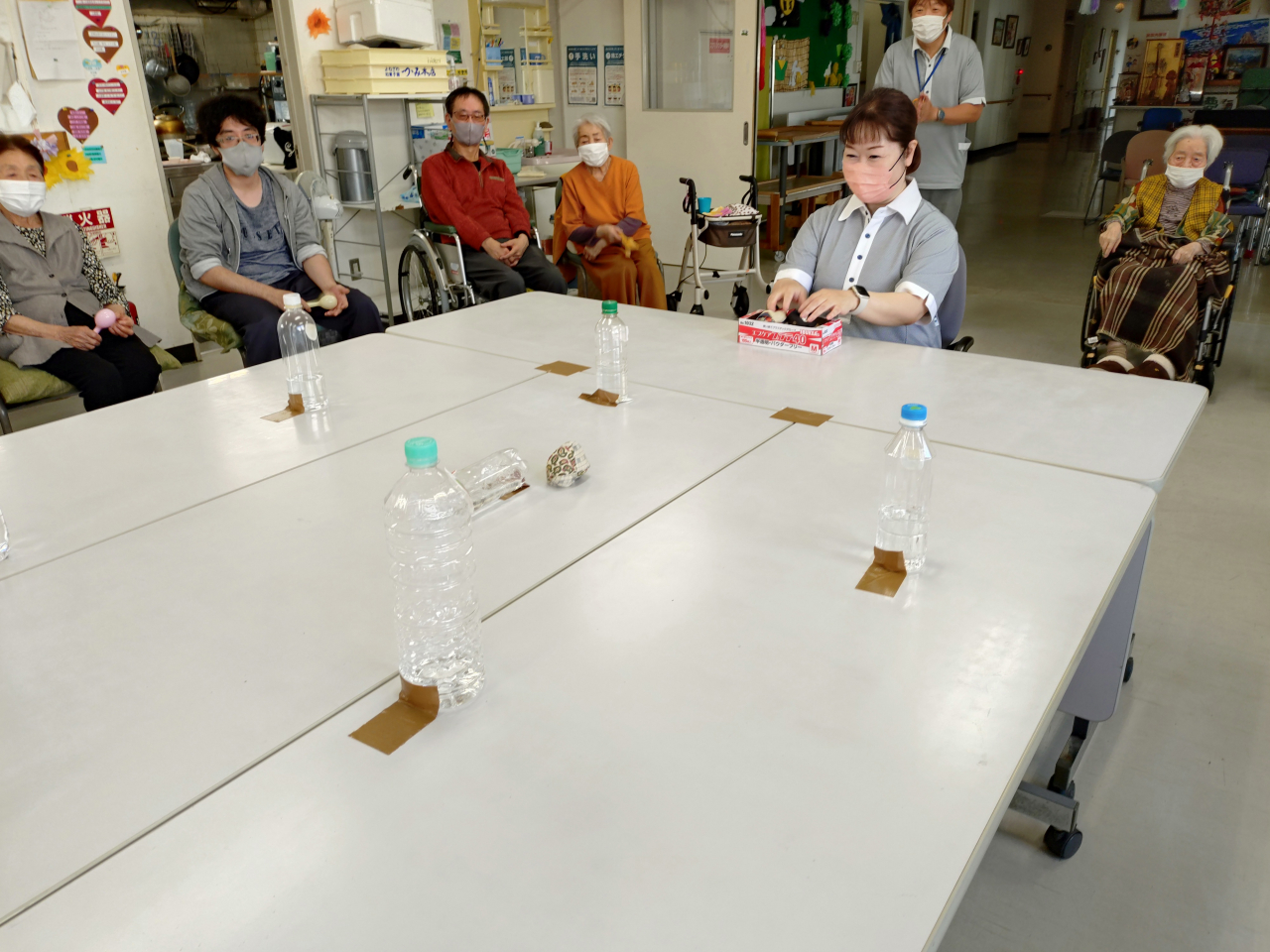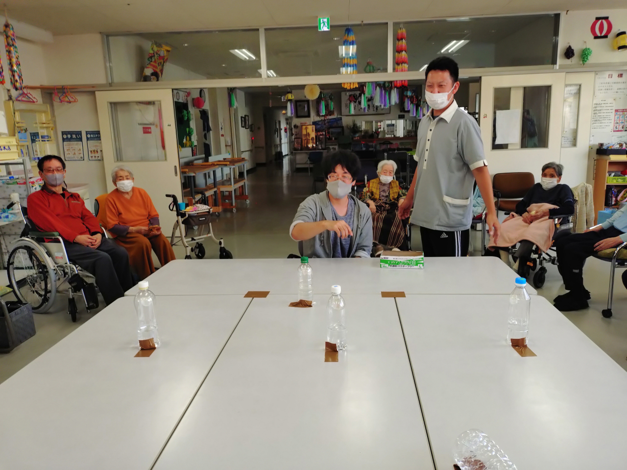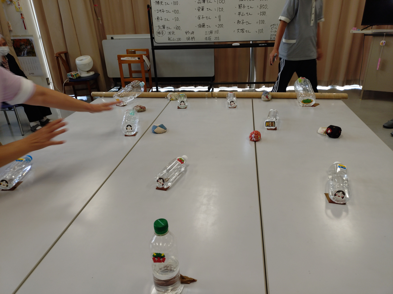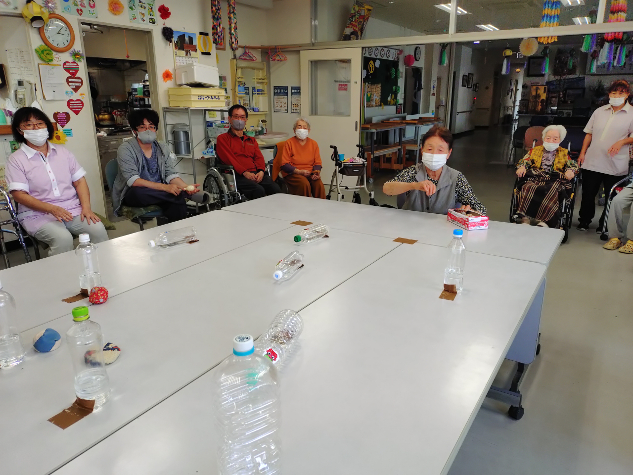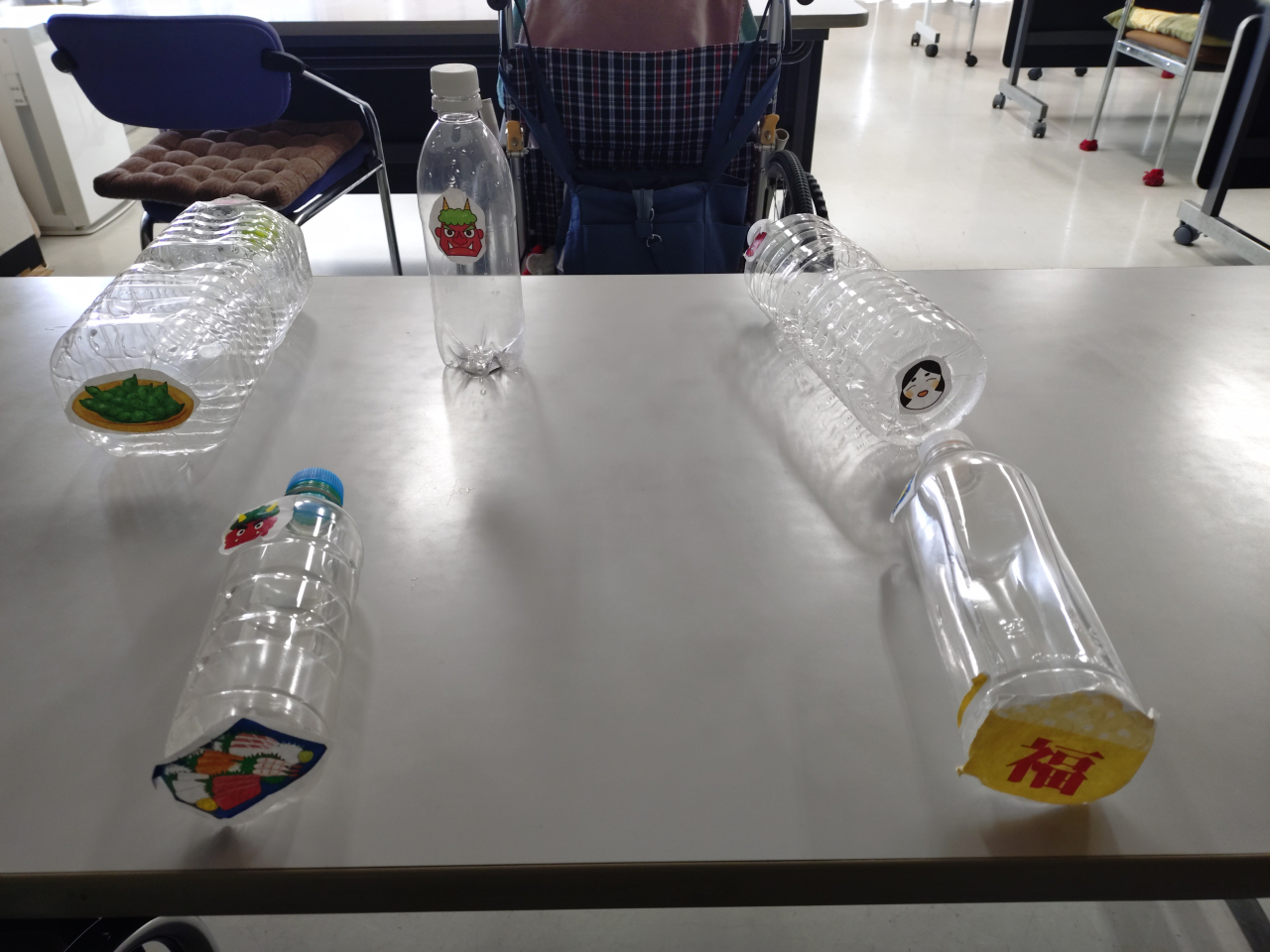 ペットボトルの正面に鬼が貼り付けられています。今回は利用者様と職員が時間を忘れ、遊び・楽しんで行いました。